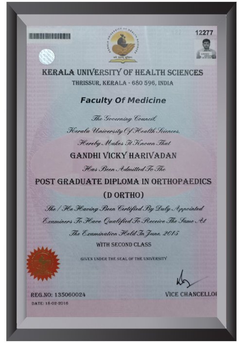 He got admission in MBBS in M.S. University in 2005. He completed MBBS in 2011. He was passionate to become orthopaedic surgeon. He started preparation for NEET pg entrance & got admission at Kottayam medical College, Kerala in 2013 & there he finished Diploma in orthopaedics in 2015.
